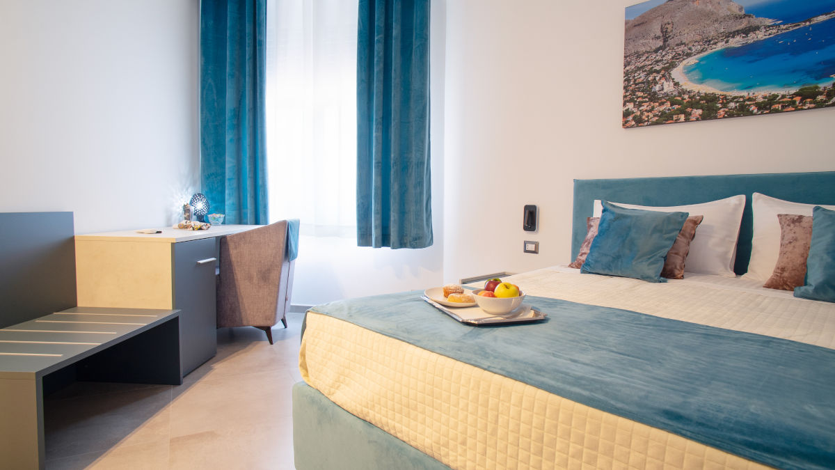 Evocando l’atmosfera rilassata e accogliente della famosa spiaggia di Mondello, la nostra Camera Mondello offre un ambiente tranquillo e luminoso per due ospiti. Con i suoi 24 mq, questo spazio è stato progettato per offrire il massimo comfort e praticità.